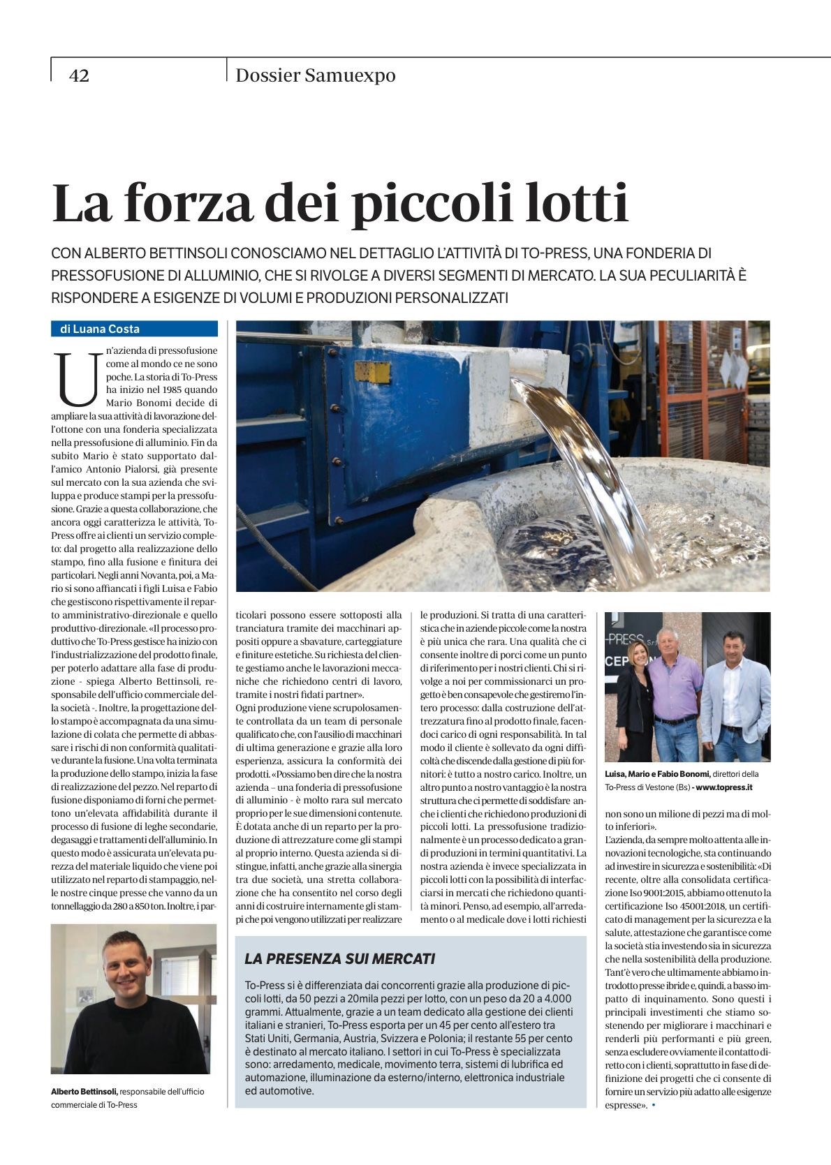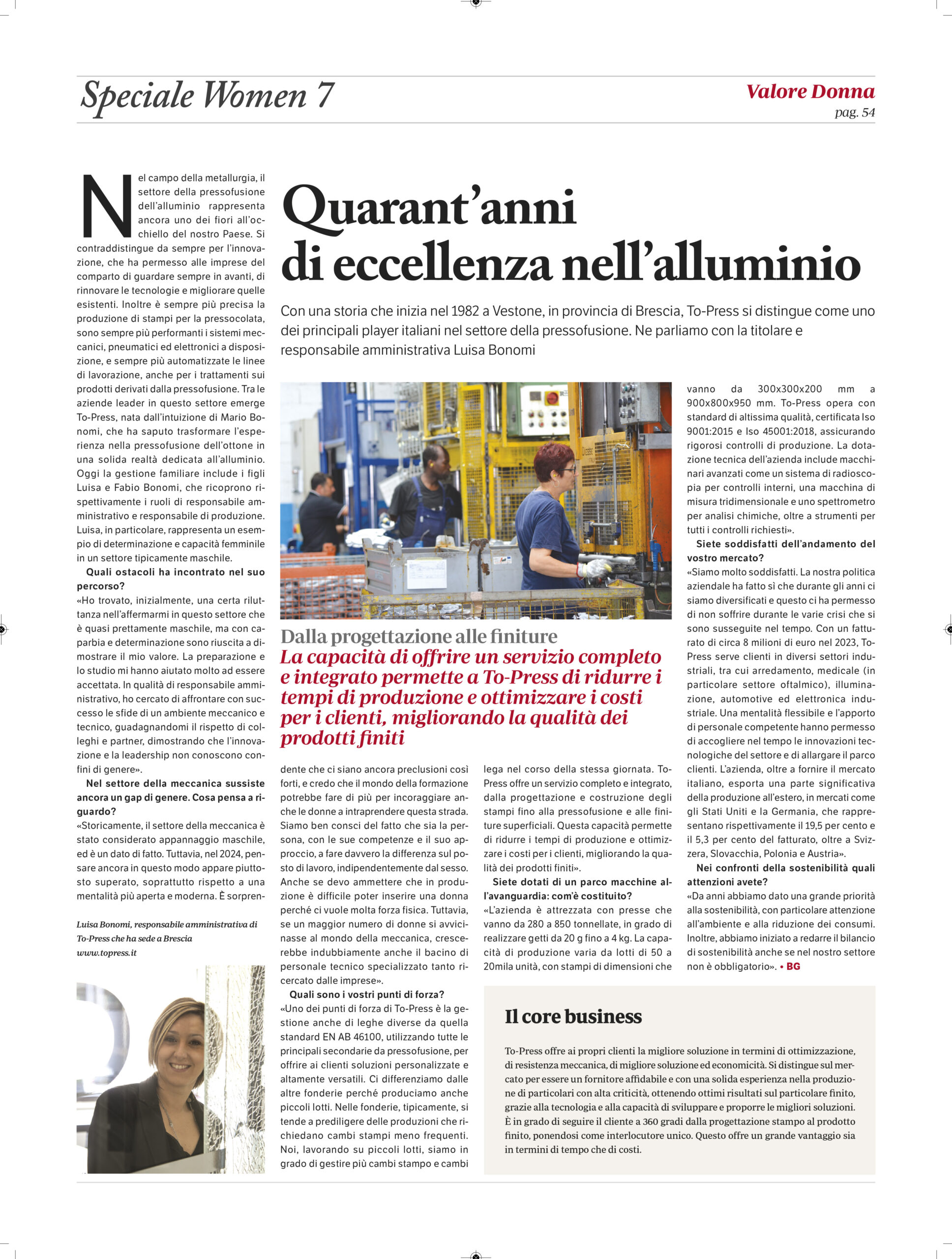 To-Press è una realtà produttiva solida e dinamica, composta da un team di circa 30 professionisti. Con una forte presenza sia sul mercato nazionale che internazionale, l’azienda ha saputo mantenere la propria identità tradizionale, mentre cresce e si evolve, grazie anche al passaggio generazionale che ha portato i figli a rafforzare la visione e i valori familiari, garantendo al contempo un continuo sviluppo della qualità e della professionalità.